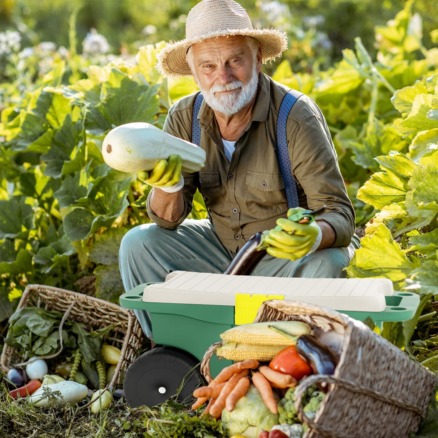 ROLLING GARDEN CART WITH SEAT – This garden stool is ideal for anyone eager to ease back and knee pain when planting and weeding, as its lid offers a sturdy seat that makes low-to-the-ground tasks much easier, with less need for crouching and stooping.